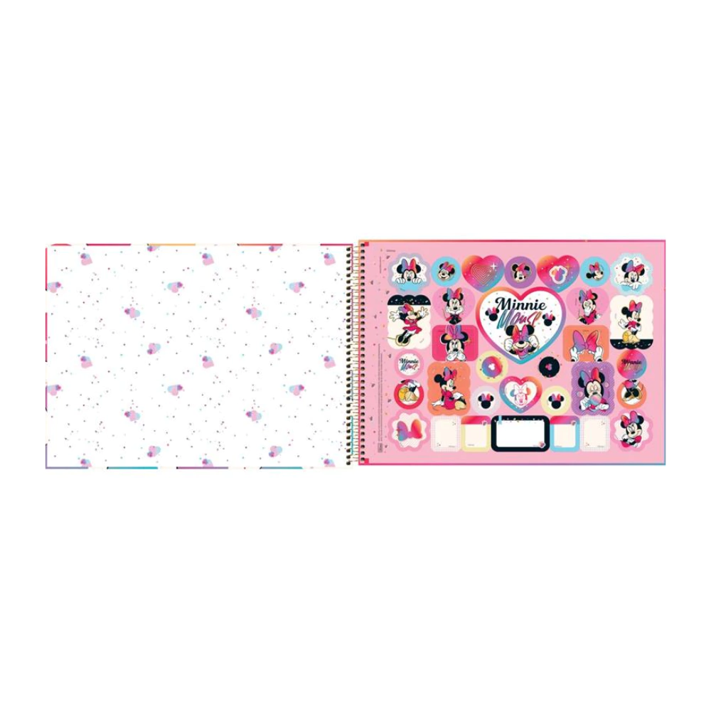 O Caderno de Cartografia e Desenho Espiral Capa Dura Minnie 80 Folhas possui capa dura com a parte interna decorada, folha de adesivos e folhas sem pautas.