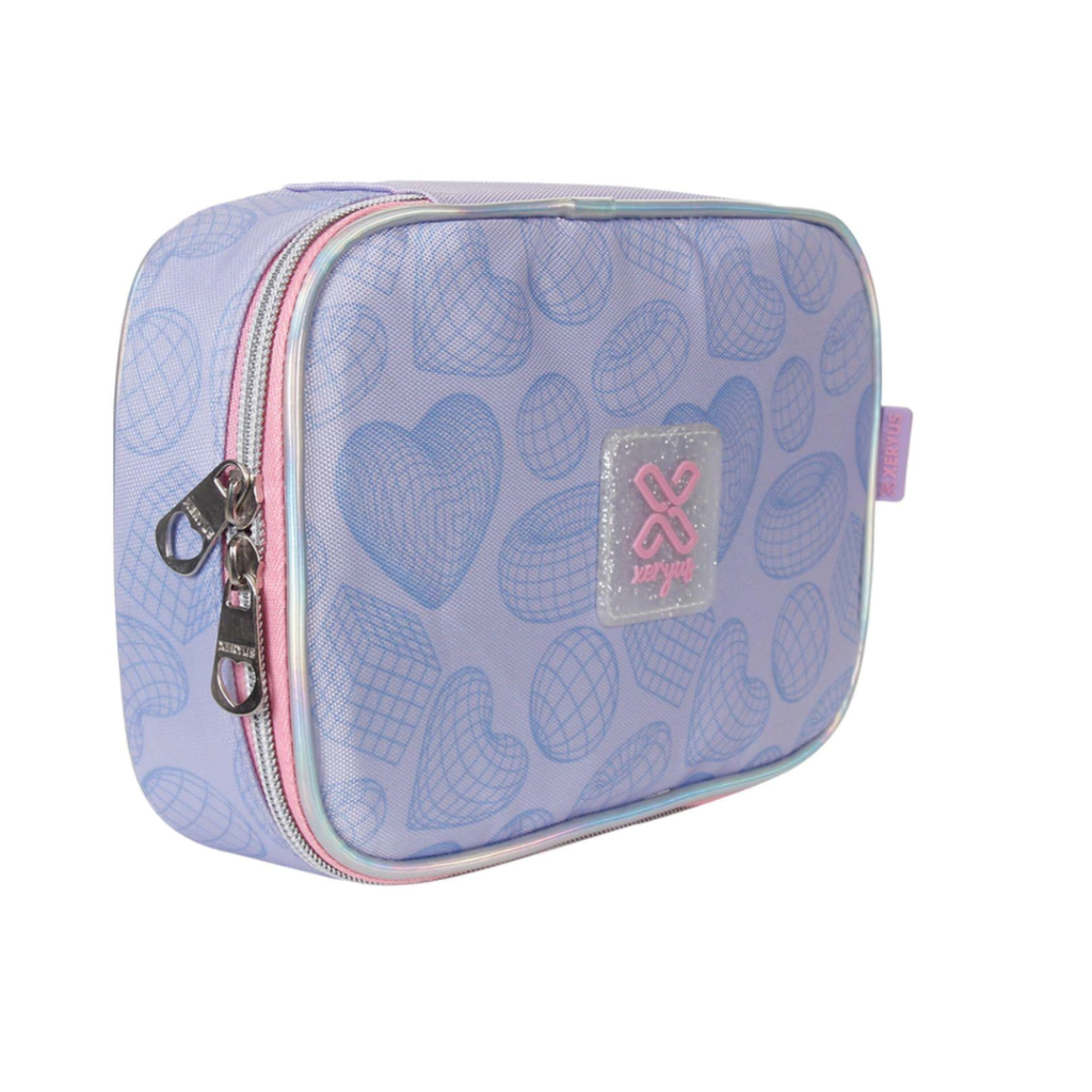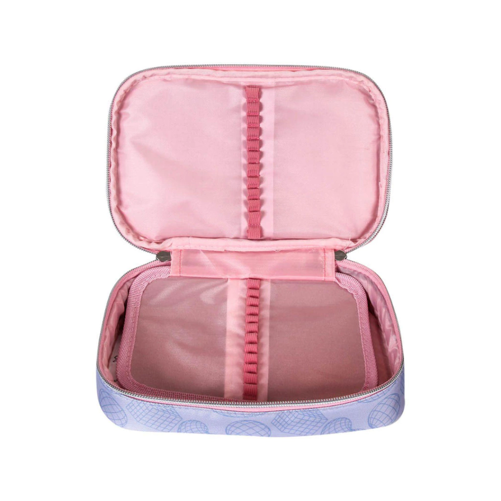 Estojo Box - Produzido em poliester resistente estampado. Possui 1 compartimento principal amplo e 1 aba com elasticos para posicionar lapis e canetas. Aplicacao de detalhes em PU metalizado holografico . Ziper com puxadores personalizados. Uso de 100pens.