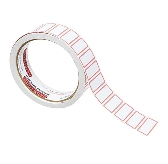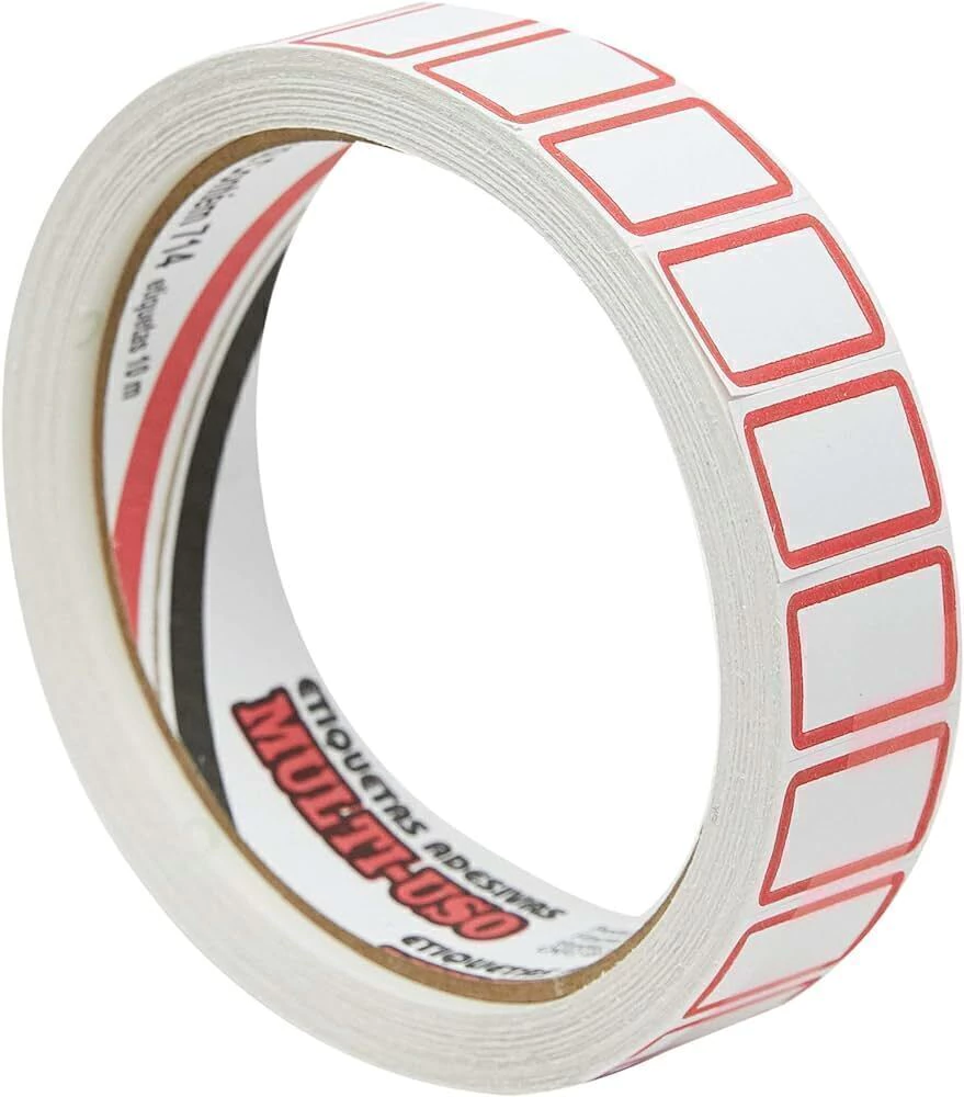 Etiqueta branca com tarja vermelha, fabricada em papel não plastificado, medida 22mm x 14mm.