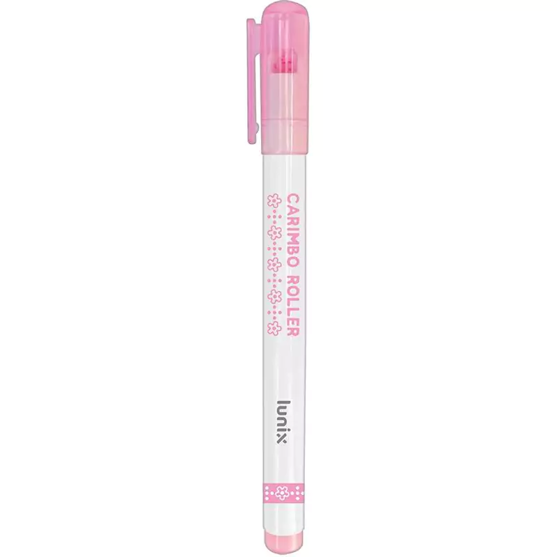 O Carimbo Roller Lunix tem formato de caneta, com tinta a base de agua, nas opcoes de estampas de coracoes lilas, flores rosas, tracejados laranjas e ondas azuis.