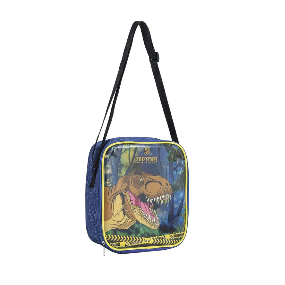 A Lancheira Térmica BRW Raptor Dino Azul e Amarelo é um acessório de transporte de alimentos com isolamento térmico, apresentando um design temático de dinossauros, nas cores azul e amarelo.
