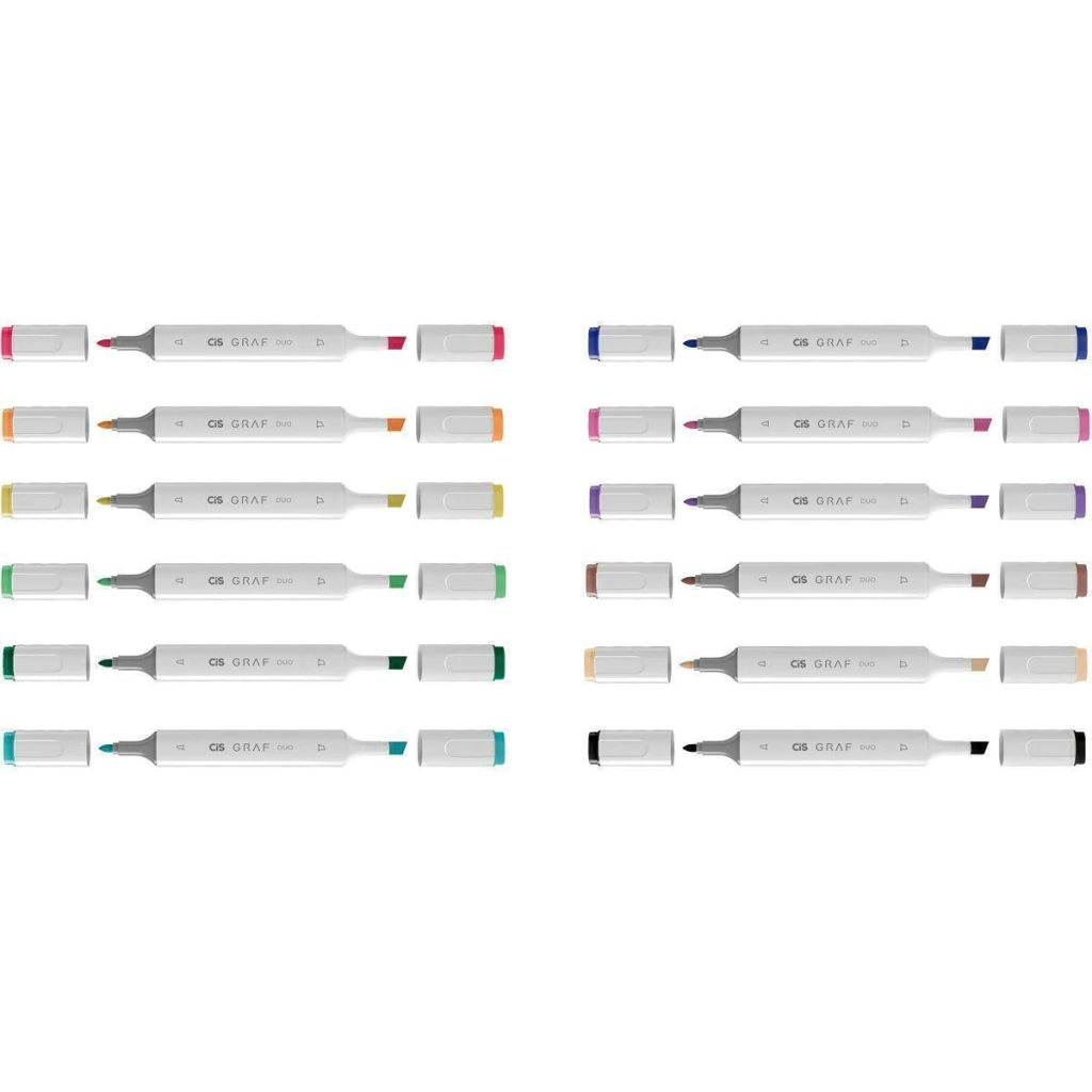 Corpo com design ergonômico na cor branco. Em cada uma das pontas vem impresso a cor da caneta, assim como o nome e o número da cor, facilitando a identificação.