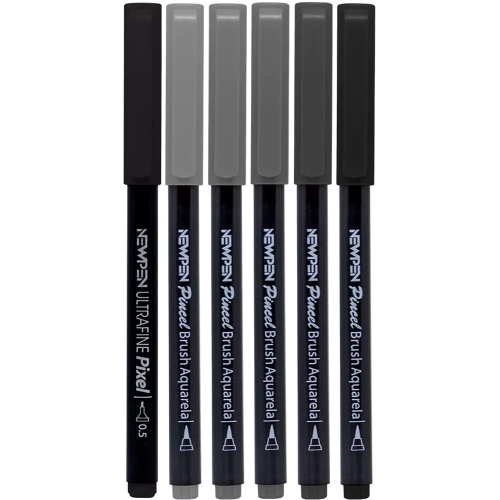 Disponivel 6 tons de cinza, tinta a base de agua com sua ponta de nylon de 4 mm para tracos mais largos e perfeitos, pincel atoxico, secagem rapida e apos o uso manter fechada