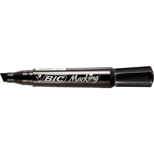 Marcador Permanente Recarregável BIC com ponta chanfrada que permite traço fino ou grosso.